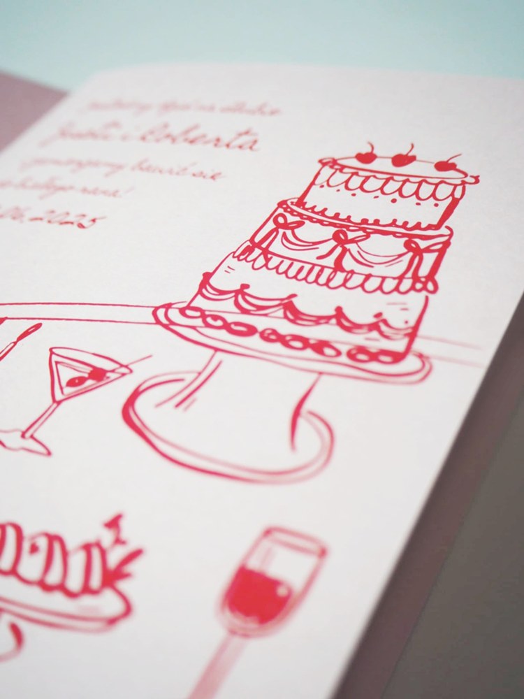 Ilustracje przedstawiające tort weselny, kieliszki, świeczniki i ślubne przysmaki sprawiają, że kartka emanuje radością i wyjątkową atmosferą wesela. Produkt drukowany jest na wysokiej jakości papierze, do kompletu dołączona jest elegancka różowa koperta. Możliwość dokupienia stylowego odbicia lakowego z motywem wiśni dodaje spójności.