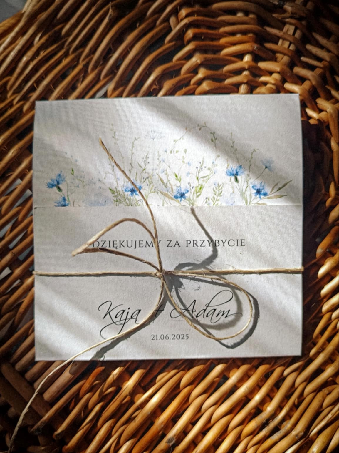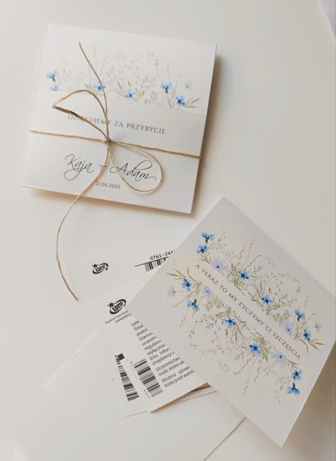 Podaruj swoim gościom wyjątkową pamiątkę z Waszego ślubu! Nasze etui na zdrapki weselne to personalizowany dodatek, który idealnie sprawdzi się jako prezent dla gości weselnych. Wykonane z wysokiej jakości papieru, zdobione delikatną grafiką polnych kwiatów w odcieniach niebieskiego, zawiązane naturalnym sznurkiem – tworzy romantyczny, rustykalny klimat, który doskonale wpisuje się w styl boho i rustykalnym.
