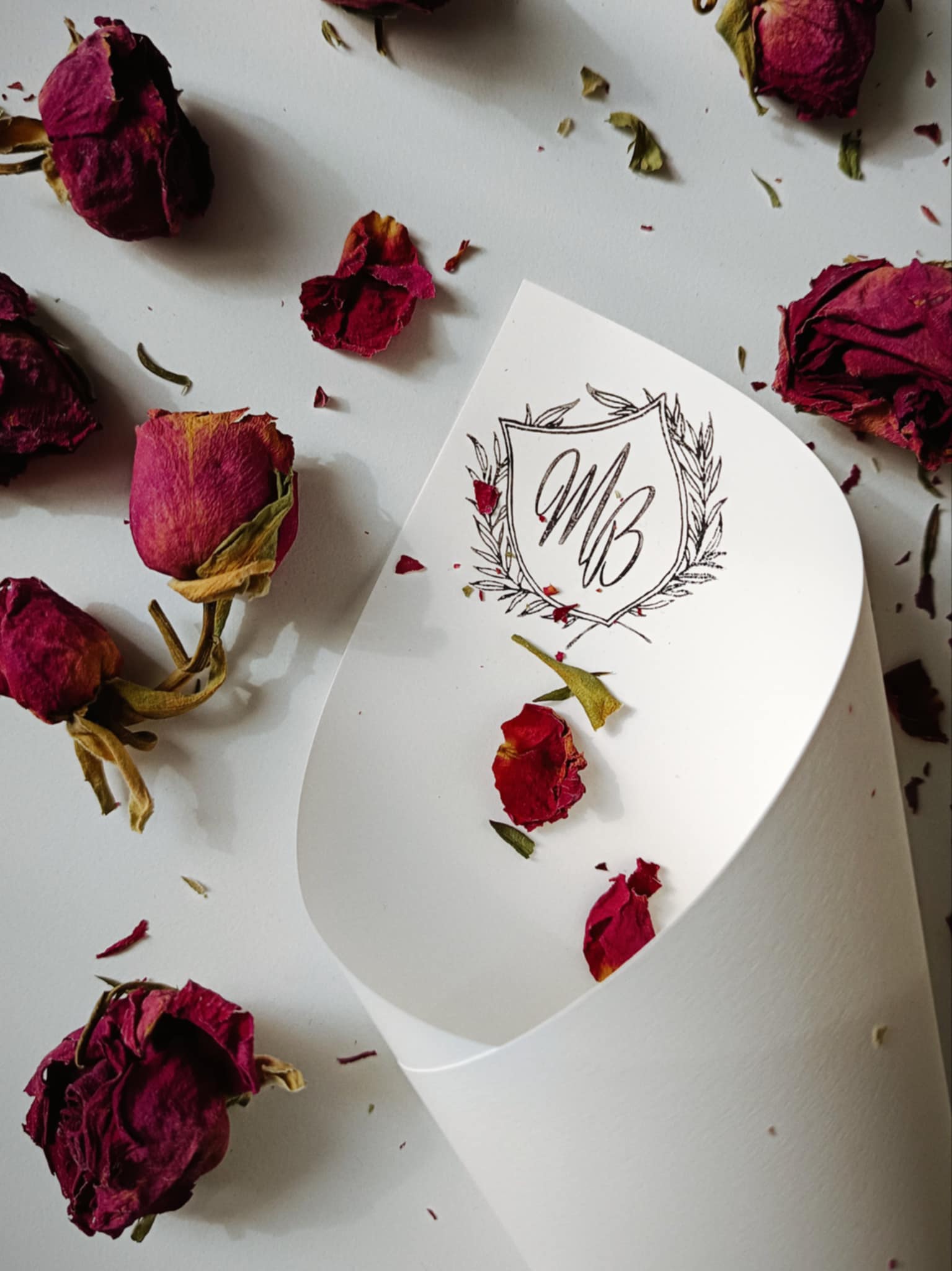 Papierowe rożki na płatki kwiatów z inicjałami Pary Młodej. Rożki należy rozdać gościom weselnym, aby mogli sypać suszonymi płatkami kwiatów gdy Para Młoda będzie wychodzić z kościoła lub urzędu. Jest to alternatywa dla sypania ryżem lub monetami.