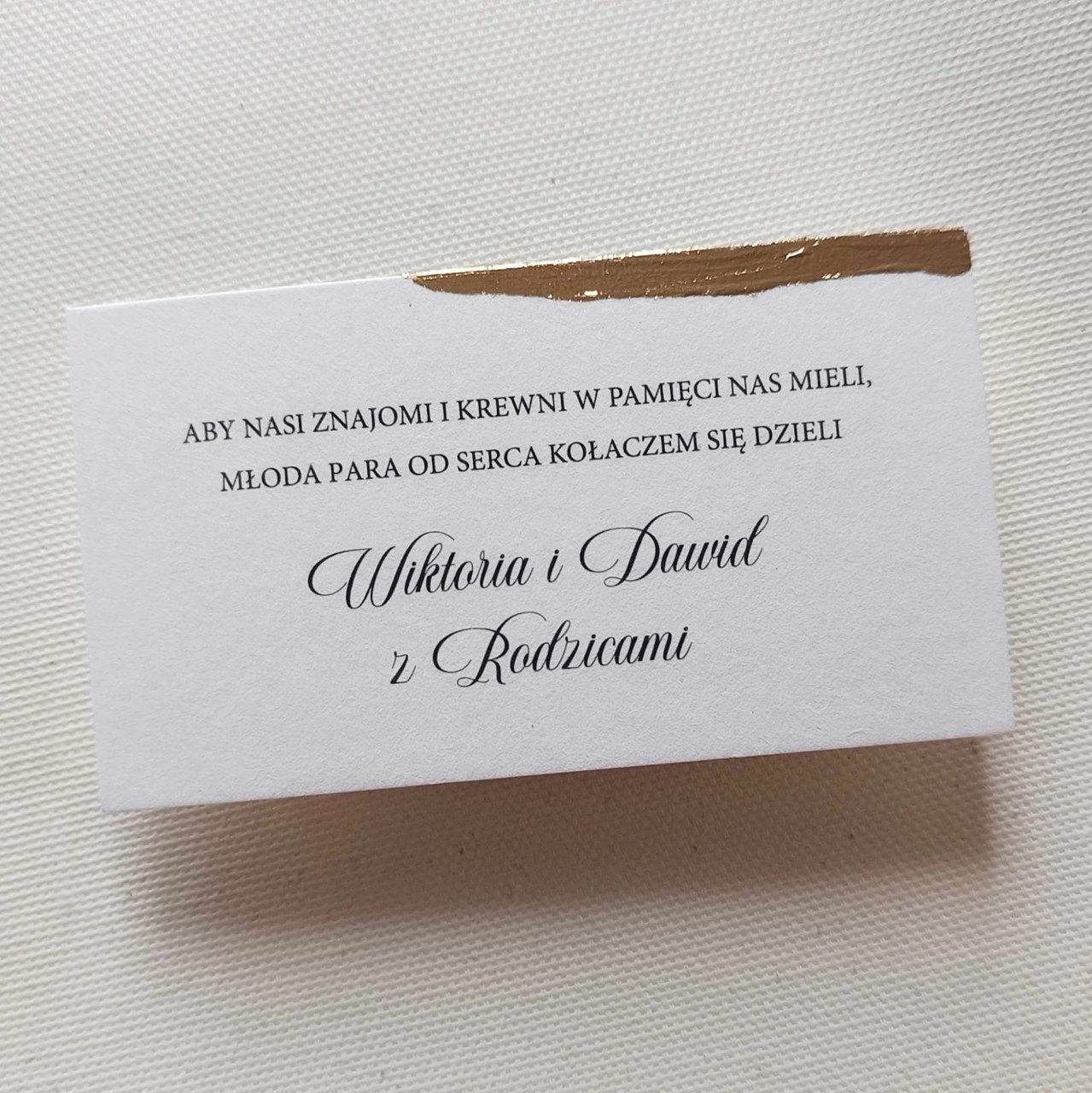 Eleganckie karteczki na kołacz weselny. Tradycja w nowoczesnym wydaniu. Szukasz czegoś oryginalnego? Zamów papeterię ślubną spójną w każdym calu. Karteczka w formie wizytówki z tradycyjnym wierszykiem oraz złoconą krawędzią.