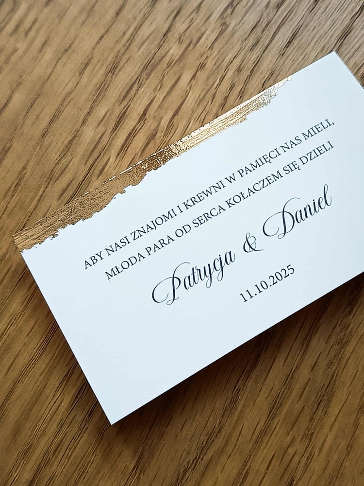 Każda karteczka zawiera krótką wiadomość lub dedykację od Pary Młodej – tekst można spersonalizować, dzięki czemu idealnie wpisuje się w charakter uroczystości. Złocenie dodaje całości elegancji i sprawia, że nawet najmniejszy detal staje się wyjątkowy.