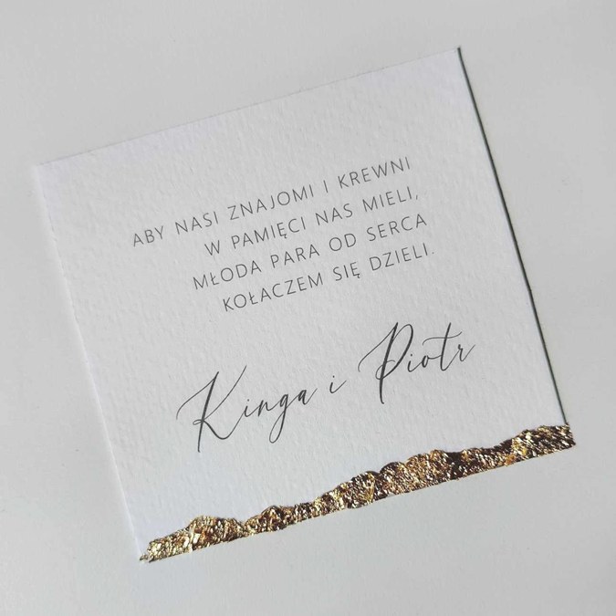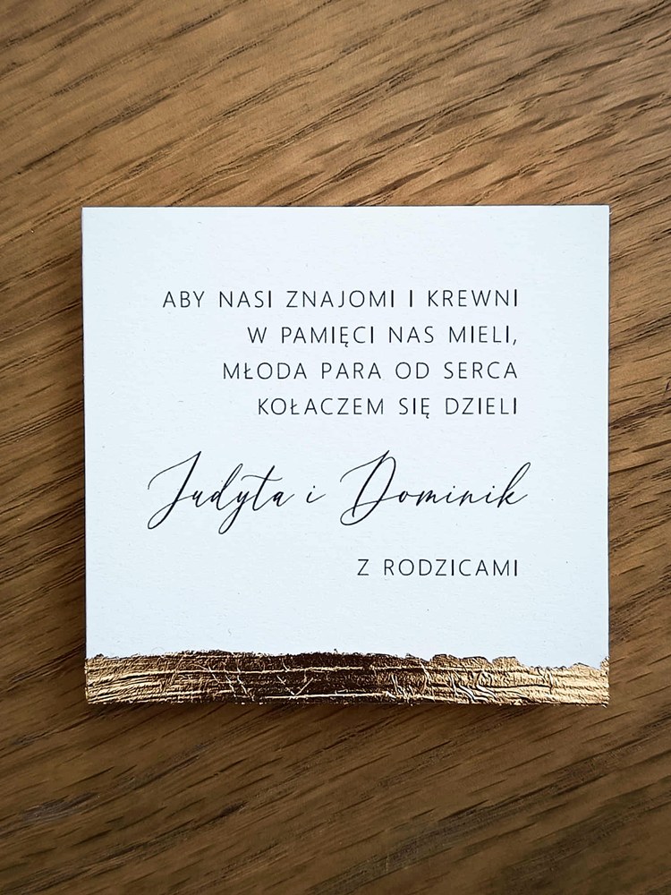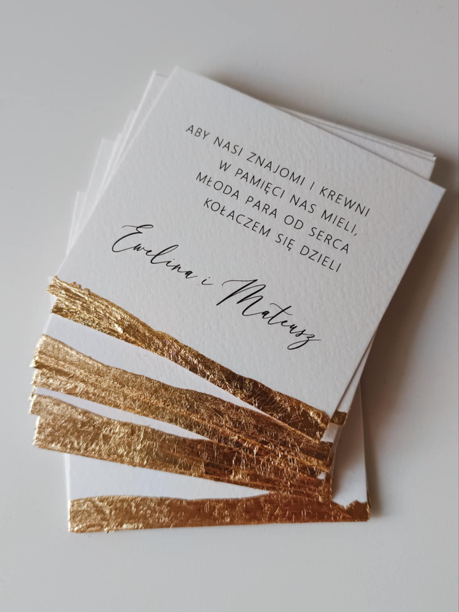 Każda karteczka zawiera krótką wiadomość lub dedykację od Pary Młodej – tekst można spersonalizować, dzięki czemu idealnie wpisuje się w charakter uroczystości. Złocenie dodaje całości elegancji i sprawia, że nawet najmniejszy detal staje się wyjątkowy.