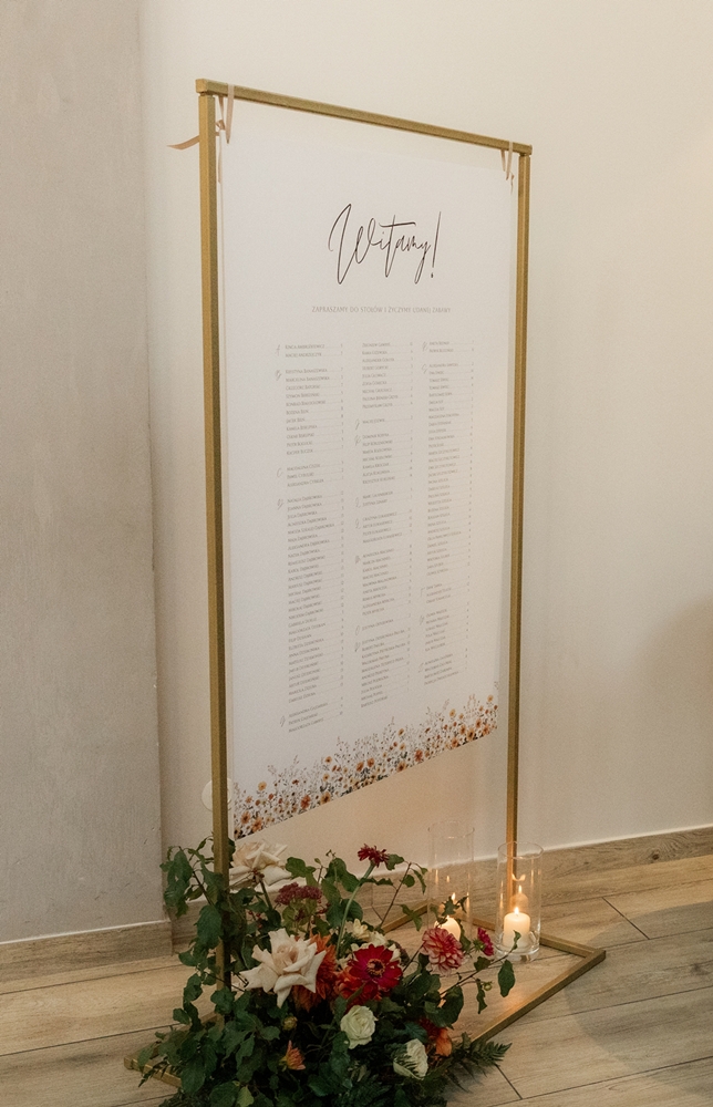 Plan stołów alfabetyczny w formie tablicy. Umieść go na sztaludze lub zawieś w widocznym miejscu. Poprowadź swoich gości już od progu sali weselnej.