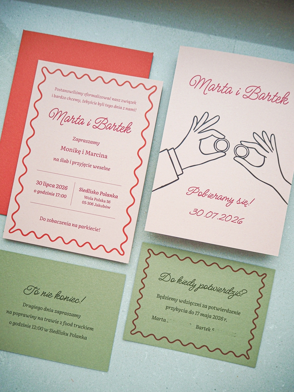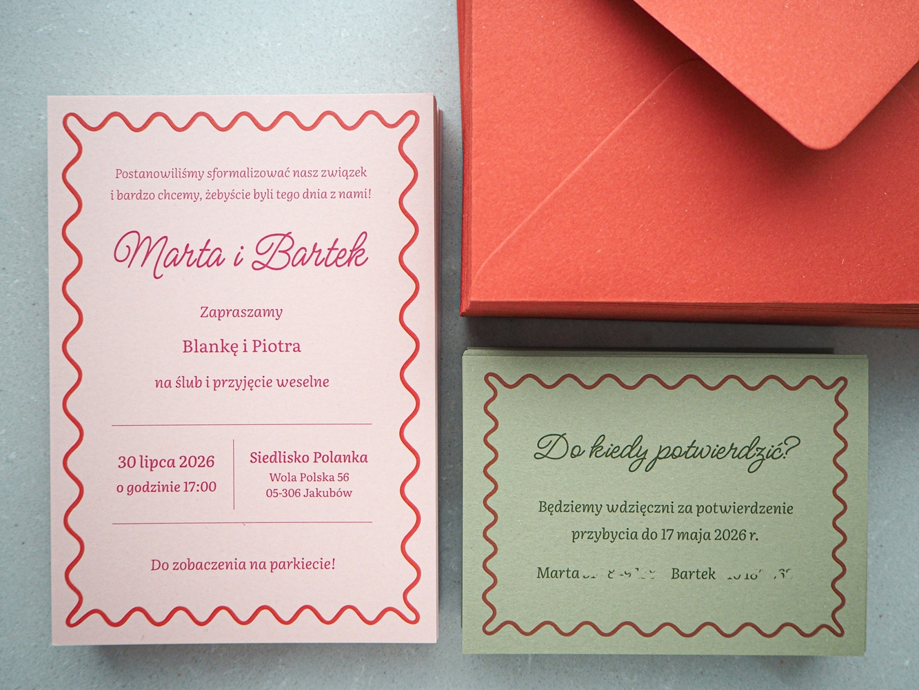Delikatne falowane brzegi, falbankowe ramki i miękkie linie to trend, który pojawia się w zaproszeniach inspirowanych stylem retro, romantycznym i modern vintage. Takie wykończenie dodaje zaproszeniom subtelnej dynamiki i sprawia, że nawet minimalistyczny projekt nabiera wyjątkowego charakteru.