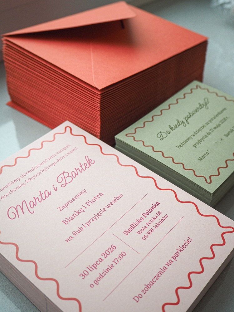 Zaproszenia drukowane są na wysokiej jakości papierach barwionych w masie, dzięki czemu kolor jest jednolity w całej strukturze arkusza, również na krawędziach. Daje to elegancki, głęboki efekt i wyjątkową trwałość.