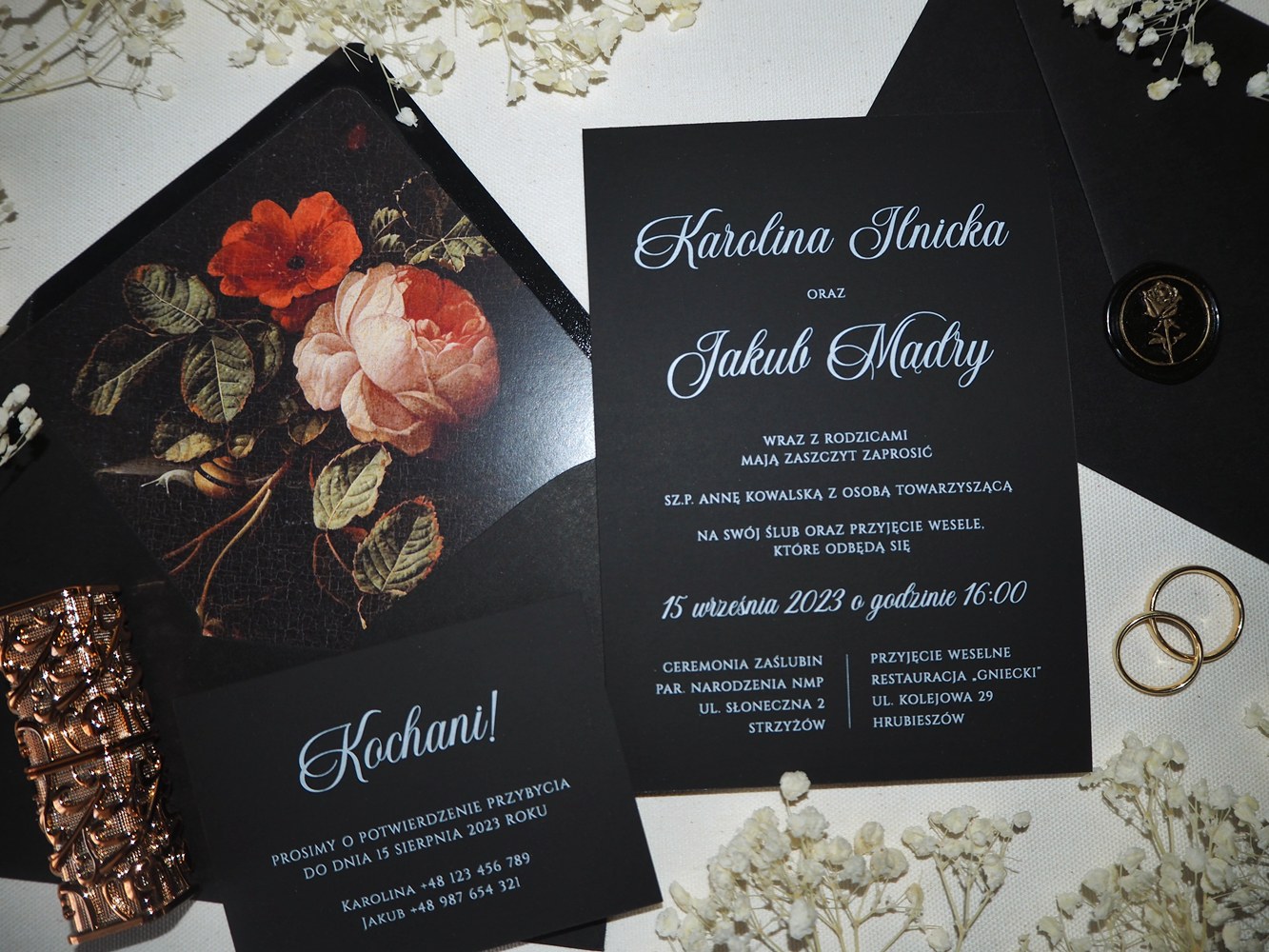 Stylowe zaproszenia ślubne dla par ceniących klasykę z nutą artystycznego wyrafinowania. Na zdjęciu zestaw zaproszeń w eleganckiej czerni, wyróżniający się wyjątkową wkładką do koperty z motywem kwiatowym w stylu vintage.